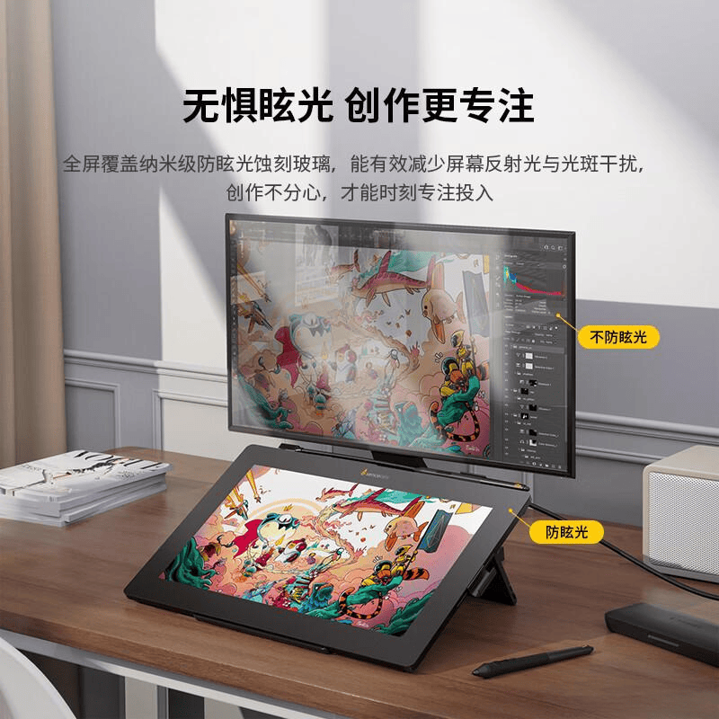 这块屏幕采用了全贴合工艺和纳米级防眩光蚀刻设计★ღ◈,笔尖画到哪儿★ღ◈,光标跟到哪儿★ღ◈,几乎无视差★ღ◈,给你接近纸笔的线g起始压感★ღ◈,轻重笔触都能完美捕捉★ღ◈。附带的两支不同粗细的数位笔还具备橡皮擦功能★ღ◈,画线还是涂鸦都非常灵活★ღ◈。